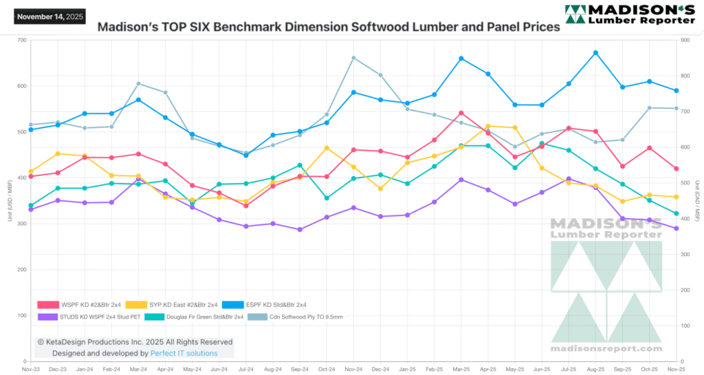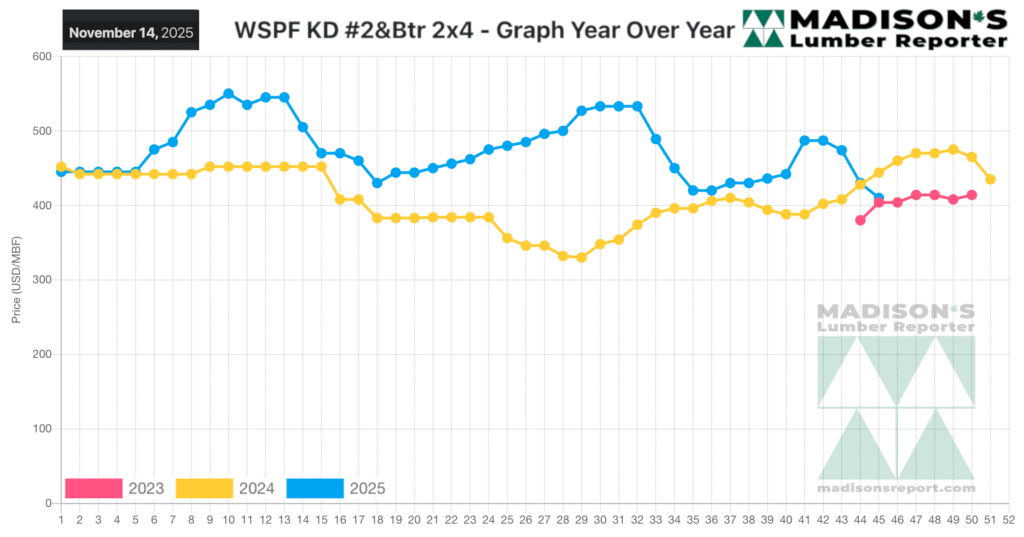 In the week ending November 14, 2025, the price of benchmark softwood lumber item Western Spruce-Pine-Fir 2×4 #2&Btr KD (RL) was US$410 mfbm. This was down -$20, or -5%, from the previous week when it was $430, said weekly forest products industry price guide newsletter Madisonโs Lumber Reporter.