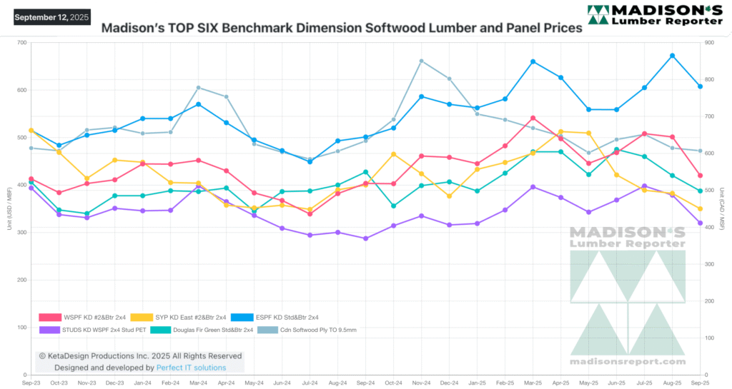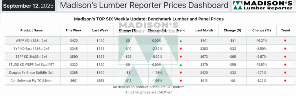 In the week ending September 12, 2025, the price of benchmark softwood lumber item Western Spruce-Pine-Fir 2×4 #2&Btr KD (RL) was US$420 mfbm. This was flat from the previous week when it was $420, said weekly forest products industry price guide newsletter Madisonโs Lumber Reporter.
