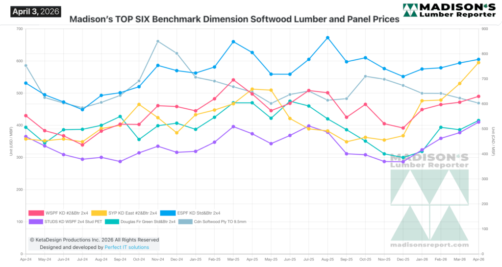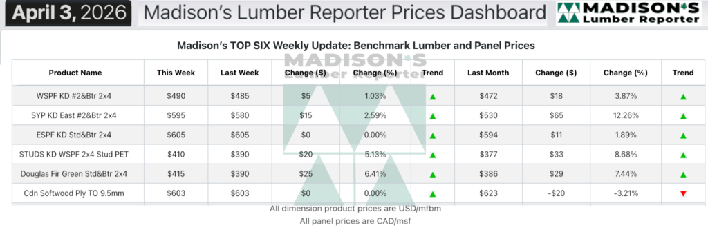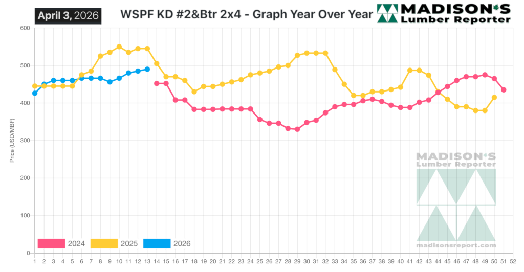 In the week ending April 3, 2026 the price of Western Spruce-Pine-Fir 2×4 #2&Btr KD (RL) was US$490 mfbm, which was up +$5, or +1%, from the previous week when it was $485, said weekly forest products industry price guide newsletter Madisonโs Lumber Reporter.