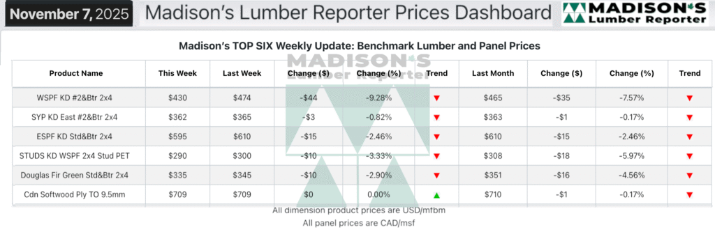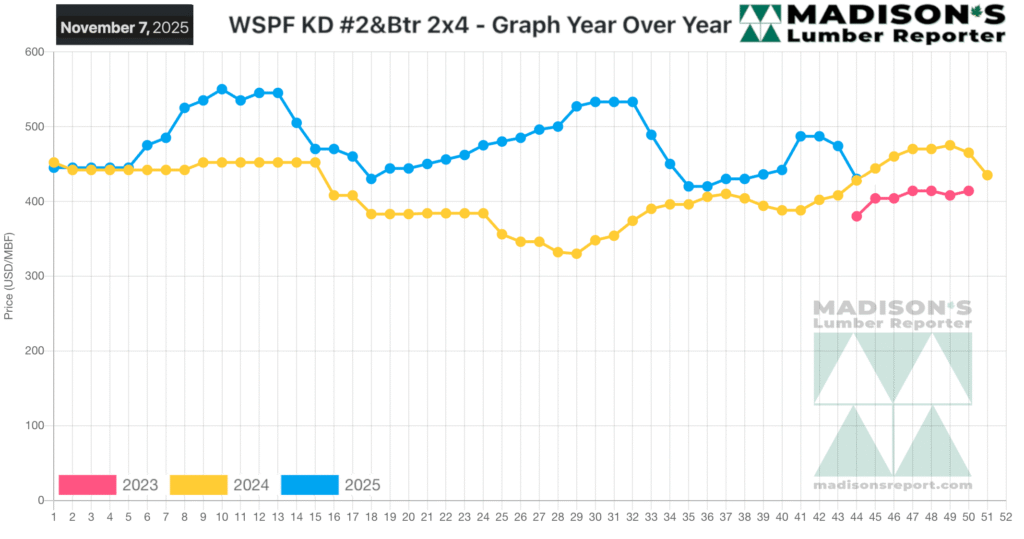 In the week ending November 07, 2025, the price of benchmark softwood lumber item Western Spruce-Pine-Fir 2×4 #2&Btr KD (RL) was US$430 mfbm. This was down -$44, or -9%, from the previous week when it was $474, said weekly forest products industry price guide newsletter Madisonโs Lumber Reporter.