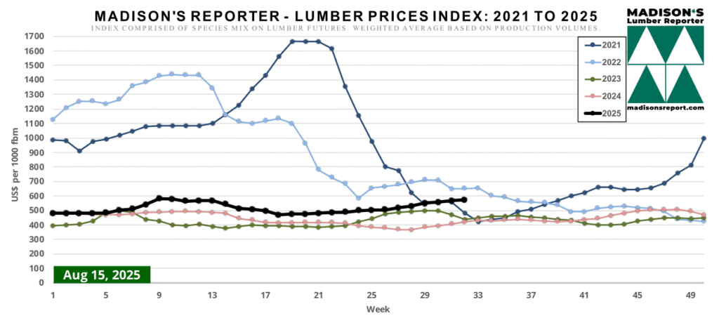 Madison’s Lumber Prices Index August 15, 2025: US$573 mfbm