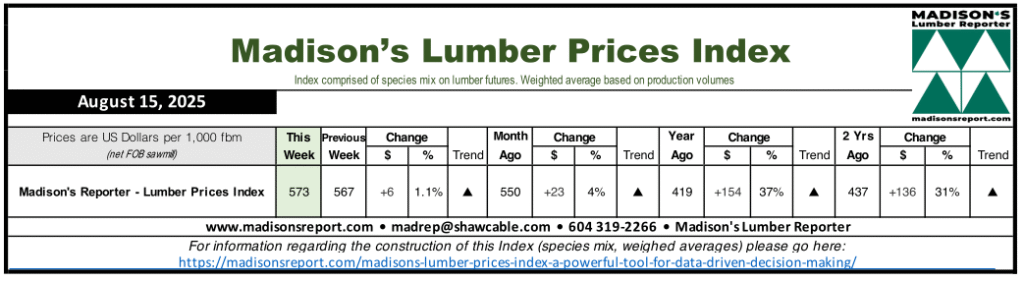 The Madison’s Lumber Prices Index for the week ending August 15, 2025 is: US$573 mfbm