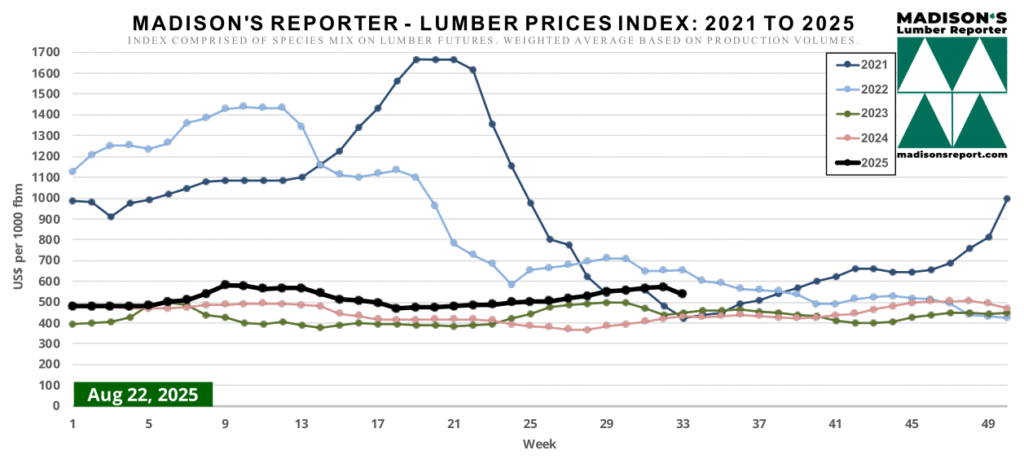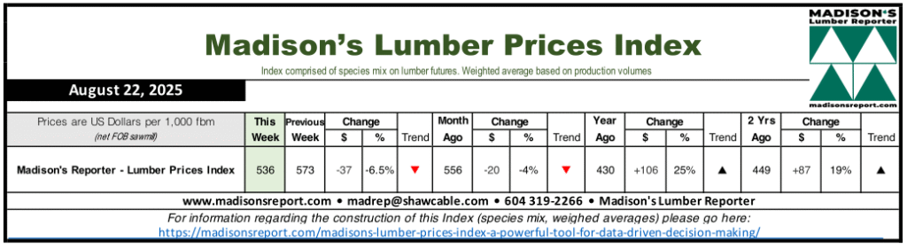 The Madison’s Lumber Prices Index for the week ending August 22, 2025 is: US$536 mfbm