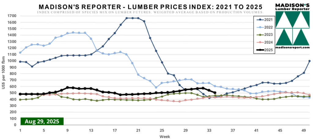 The Madison’s Lumber Prices Index for the week ending August 29, 2025 is: US$503 mfbm