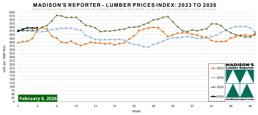 The Madison’s Lumber Prices Index for the week ending February 06, 2026 is: US$496 mfbm