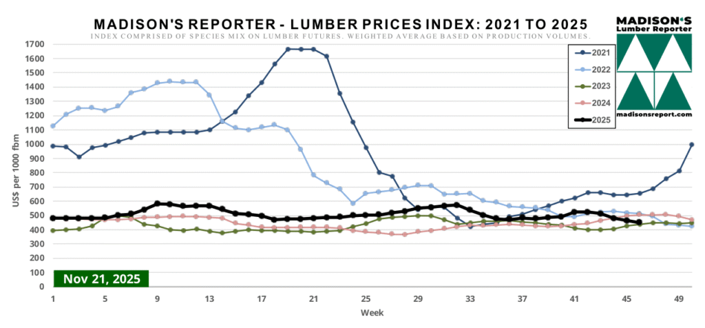 The Madison’s Lumber Prices Index for the week ending November 21, 2025 is: US$449 mfbm