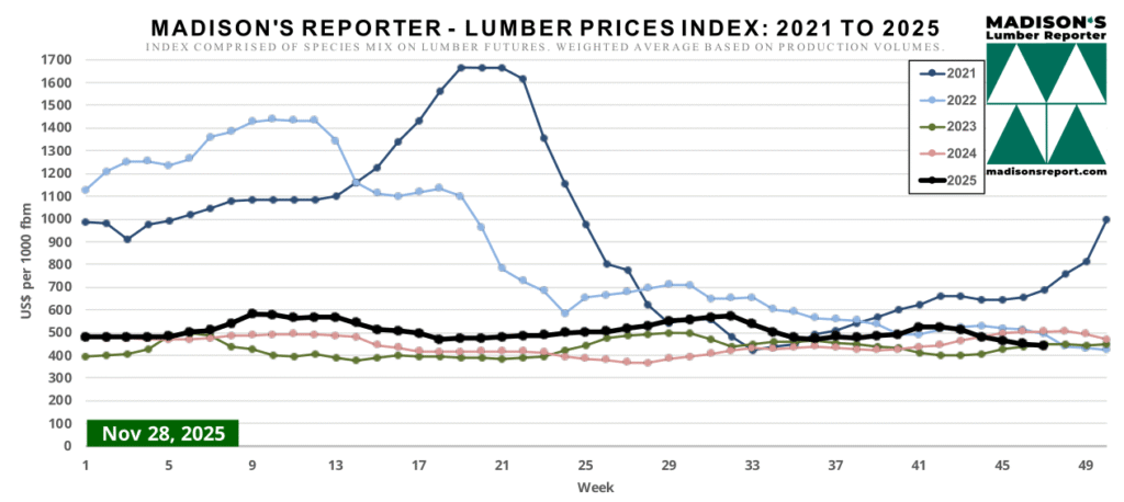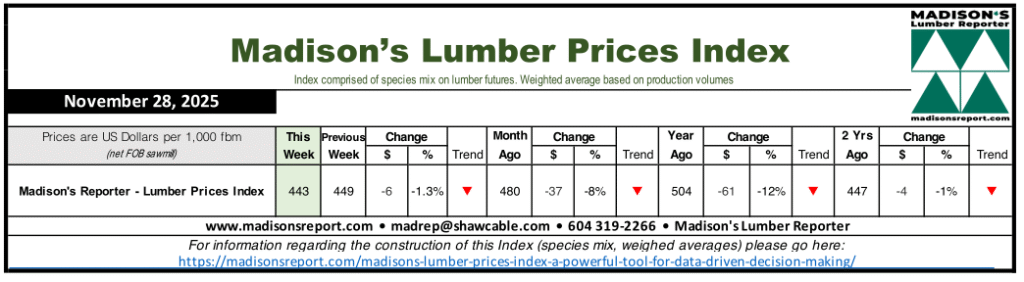 The Madison’s Lumber Prices Index for the week ending November 28, 2025 is: US$443 mfbm