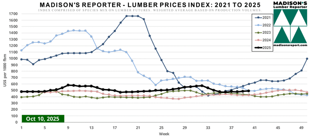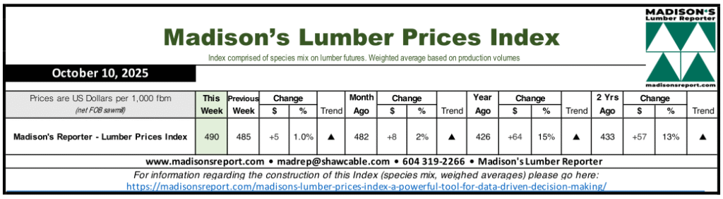 The Madison’s Lumber Prices Index for the week ending October 10, 2025 is: US$490 mfbm
