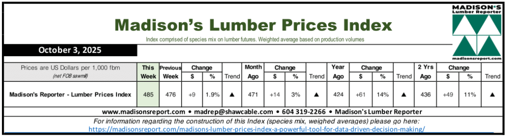 The Madison’s Lumber Prices Index for the week ending October 3, 2025 is: US$485 mfbm