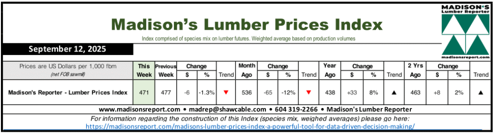 The Madison’s Lumber Prices Index for the week ending September 12, 2025 is: US$471 mfbm