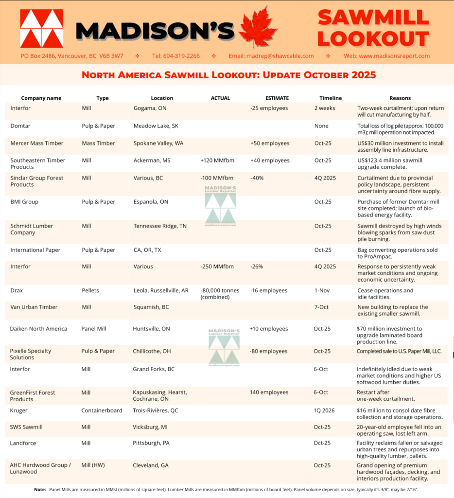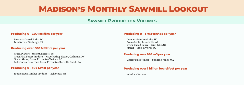 With Madison’s sawmill curtailment lookout, you will save time and money by getting the latest information on lumber manufacturer downtime and sawmill curtailments straight into your inbox: