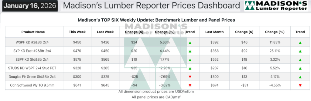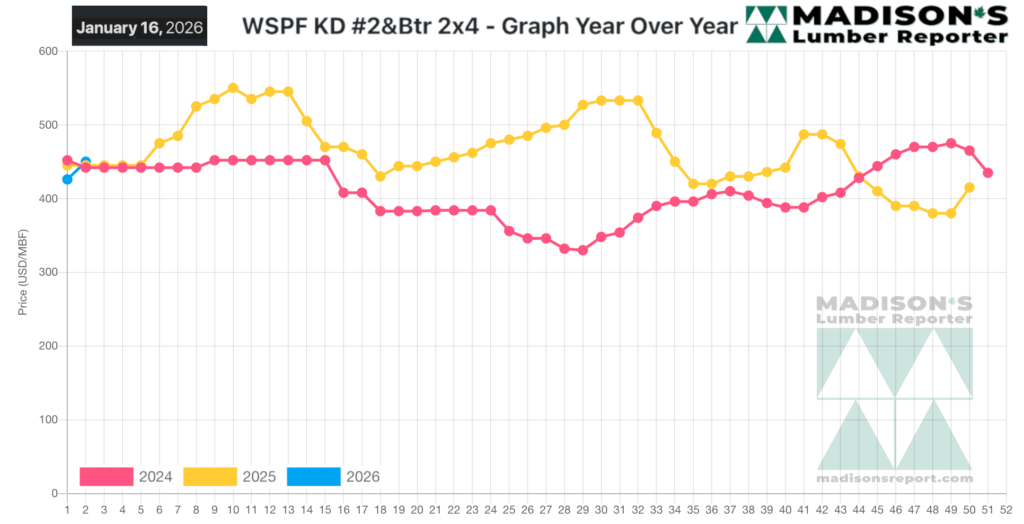 In the week ending January 16, 2026, the price of benchmark softwood lumber item Western Spruce-Pine-Fir 2×4 #2&Btr KD (RL) was US$450 mfbm. This was up +$20, or +4%, from the previous week when it was $426, said weekly forest products industry price guide newsletter Madisonโs Lumber Reporter.
