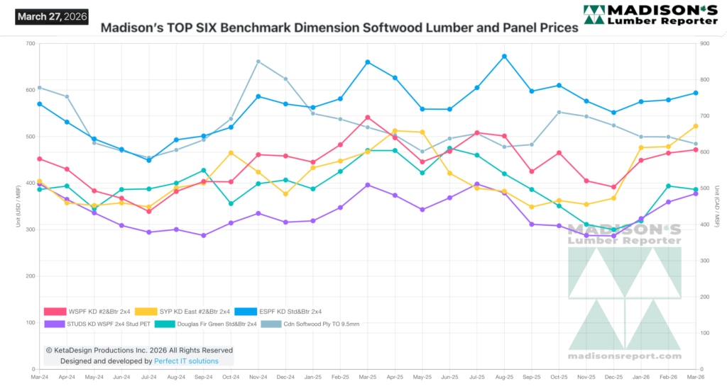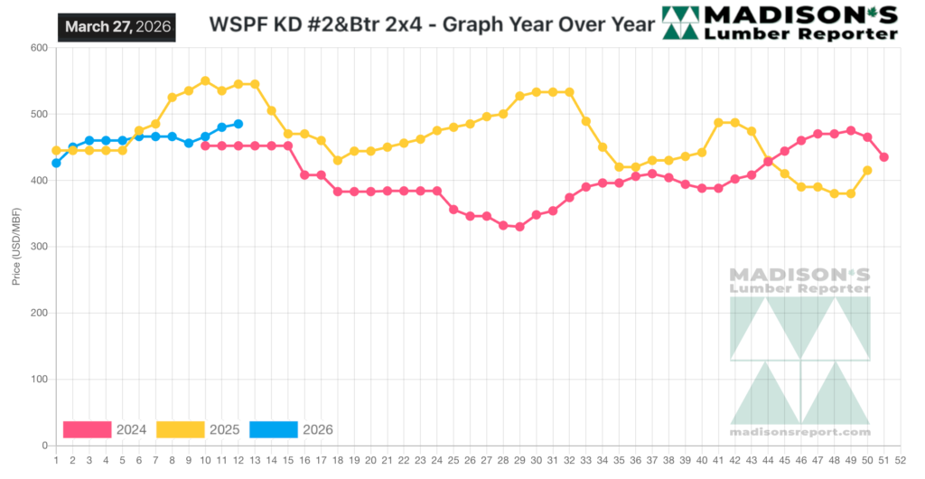 In the week ending March 27, 2026, the price of benchmark softwood lumber item Western Spruce-Pine-Fir 2×4 #2&Btr KD (RL) was US$485 mfbm. This was up +$5, or +1%, from the previous week when it was $480, said weekly forest products industry price guide newsletter Madisonโ€™s Lumber Reporter.