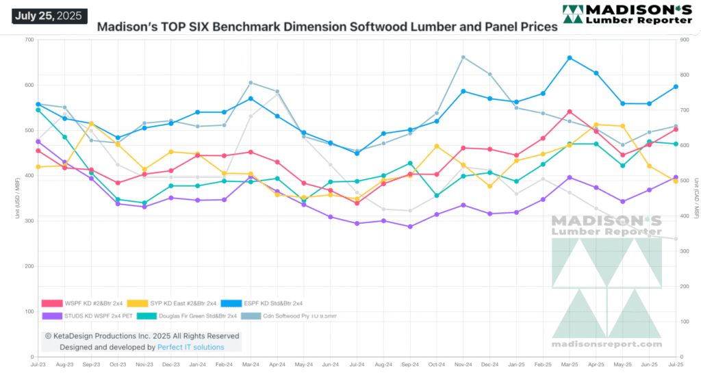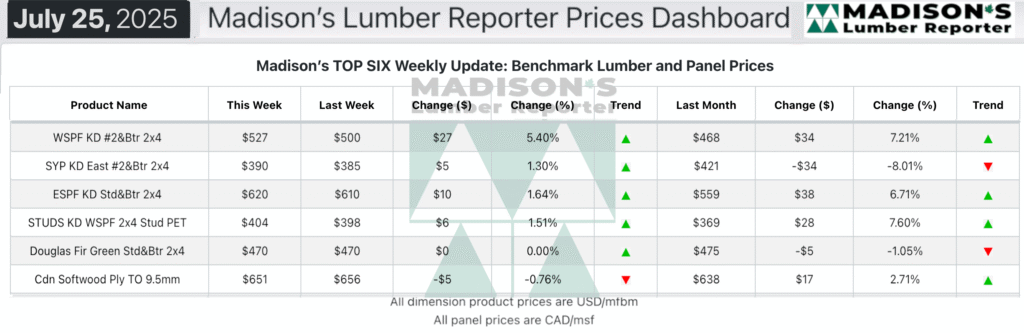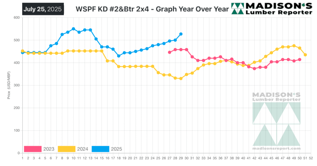 In the week ending July 25, 2025 the price of Western Spruce-Pine-Fir 2×4 #2&Btr KD (RL) was US$527 mfbm, which is up +$27, or +5%, from the previous week when it was $500, said weekly forest products industry price guide newsletter Madisonโs Lumber Reporter.