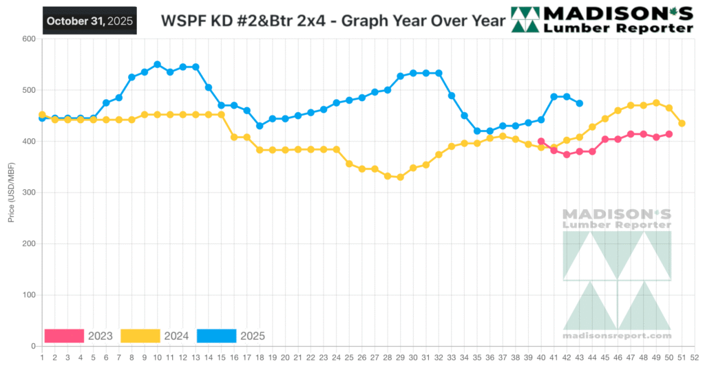 In the week ending October 31, 2025 the price of Western Spruce-Pine-Fir 2×4 #2&Btr KD (RL) was US$474 mfbm, which was down -$13, or -3%, from the previous week when it was $487, said weekly forest products industry price guide newsletter Madisonโs Lumber Reporter.